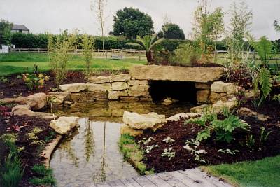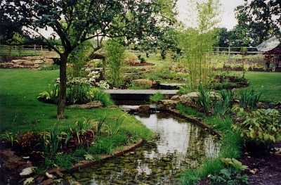 Client brief: To design a garden utilising the levels on this sloping site, with water in the garden being a high priority. A stream, integral pools and rockwork were therefore incorporated and to great effect. These were further enhanced with other focal points and features, combined with strong structural planting and large levelled lawns.