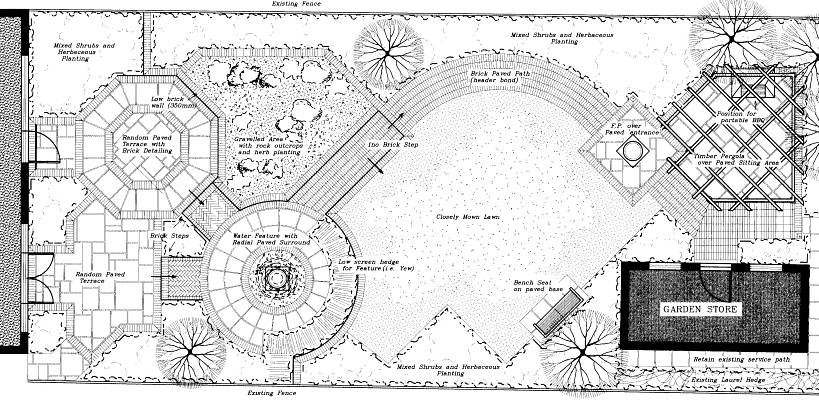 Client brief: To design a garden reducing the ‘box effect’ of this very plain town garden. It must include alternative entertaining areas, the sound of water, and reduce the effect of overlooking neighbouring houses. A lawned area along with lots of colour in the planting are also very important.