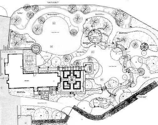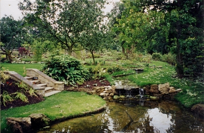 Client brief: To design a garden utilising the levels on this sloping site, with water in the garden being a high priority. A stream, integral pools and rockwork were therefore incorporated and to great effect. These were further enhanced with other focal points and features, combined with strong structural planting and large levelled lawns.