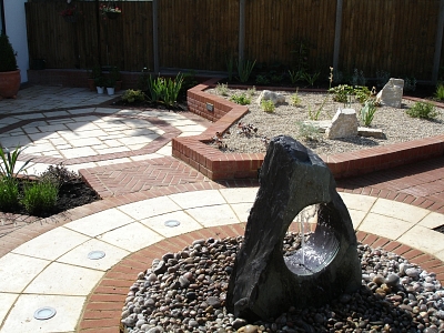 Client brief: To design a garden reducing the ‘box effect’ of this very plain town garden. It must include alternative entertaining areas, the sound of water, and reduce the effect of overlooking neighbouring houses. A lawned area along with lots of colour in the planting are also very important.