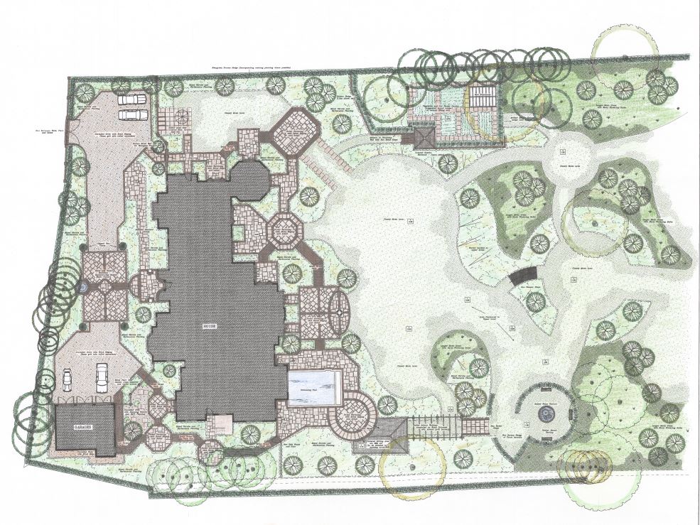The design shown is the house and its immediate surround – the overall garden totalling 7.5 acres, with the ornamental gardens being linked to more parkland style areas of naturalising bulbs and wild flowers – and all within mown grass rides and open spaces